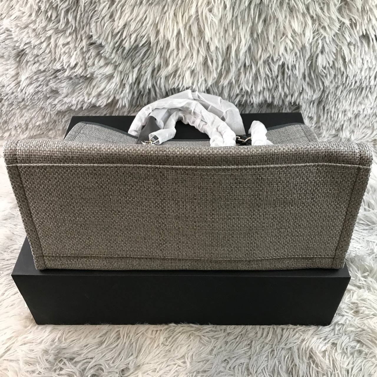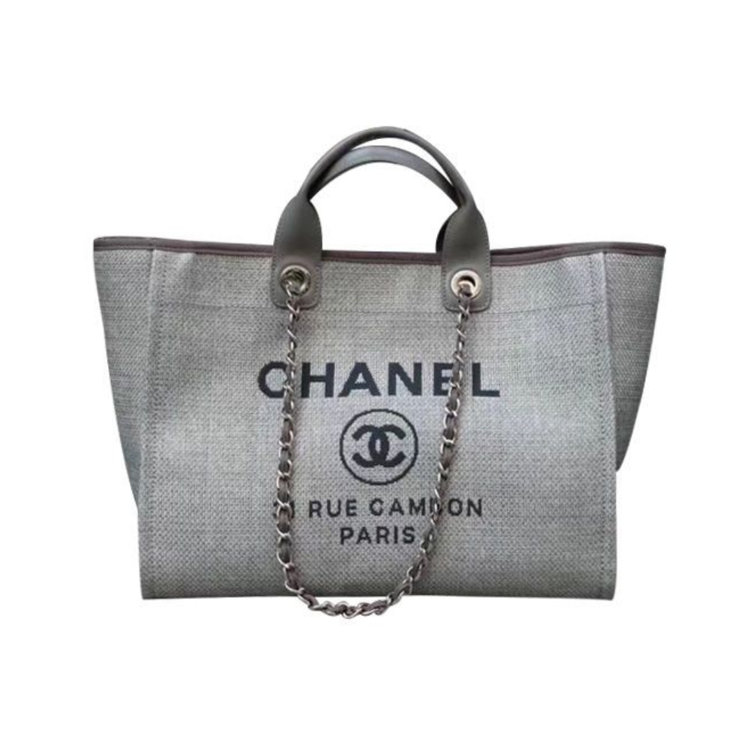 ● Shoulder strap: Double silver-tone chain intertwined with grey leather, plus double top handles in natural leather