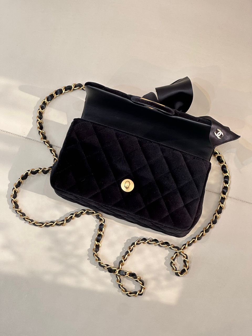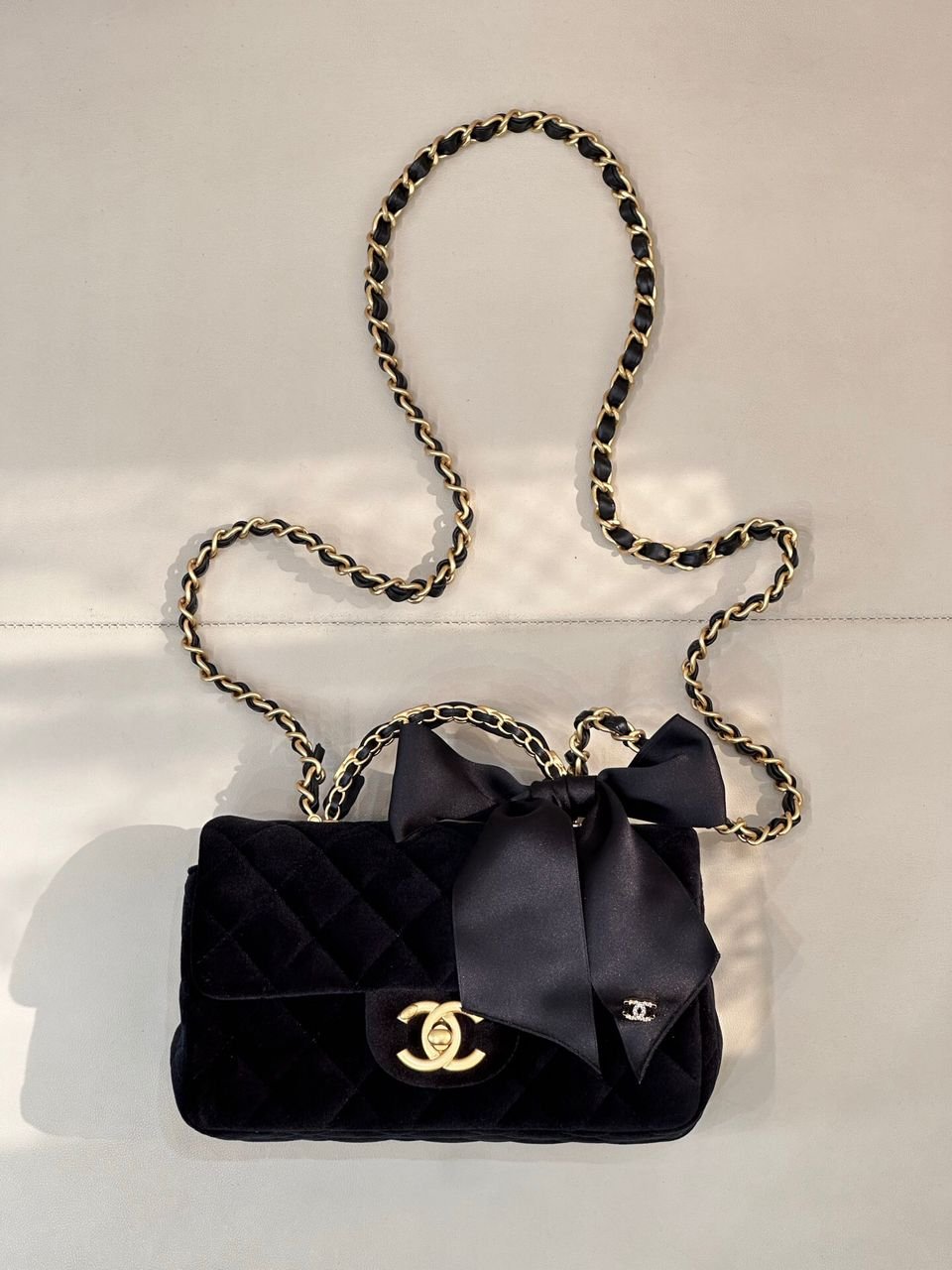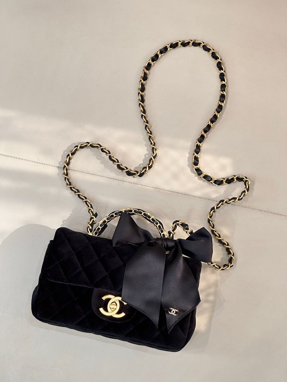 ● Shoulder strap: black leather and antique gold-tone metal braided chain